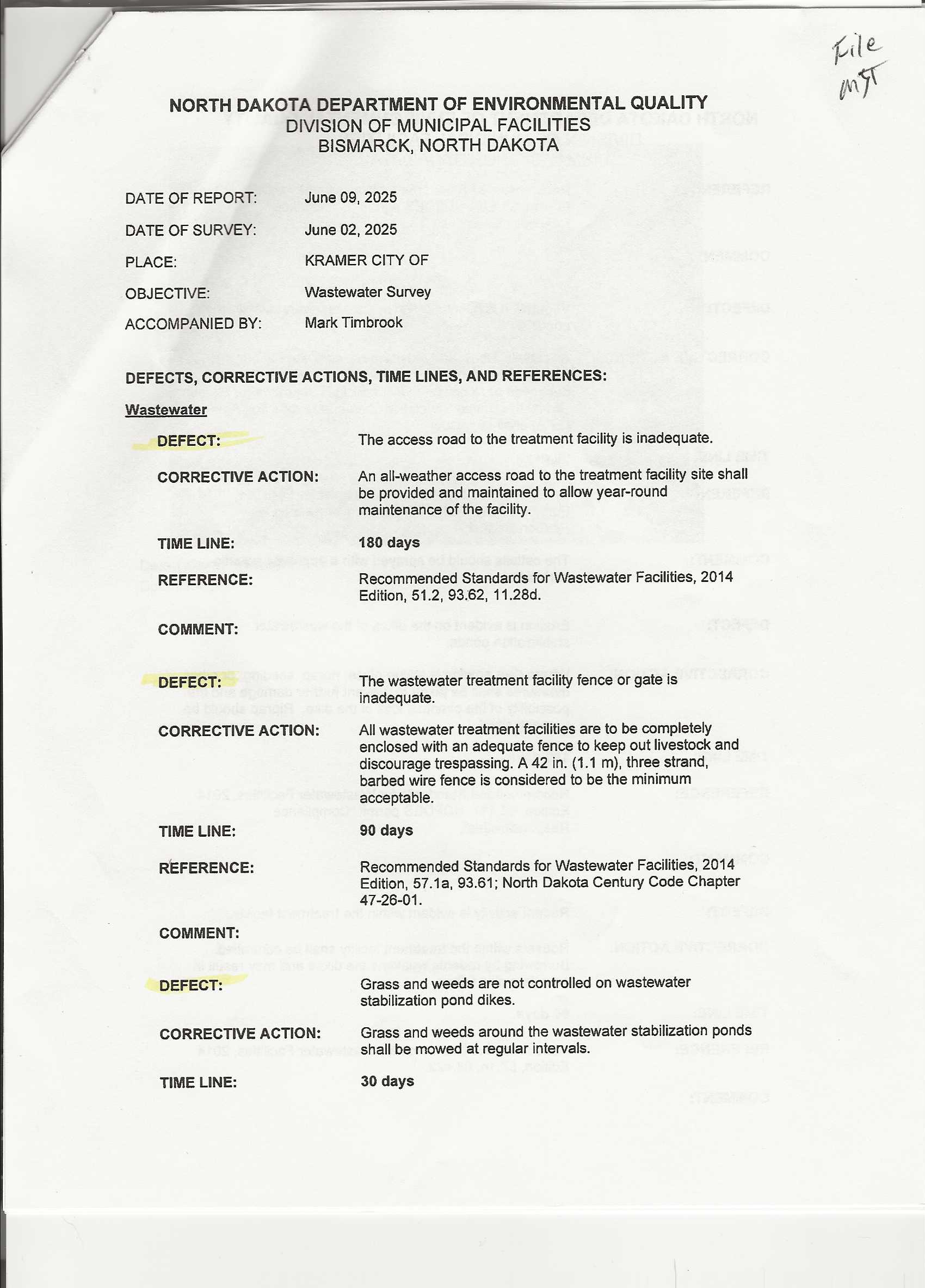 The State of North Dakota Division of Municipal Facilities inspected the City of Kramer Lift Station, Landfill, and Lagoons on 2 June 2025. The report was received on 15 July 2025.